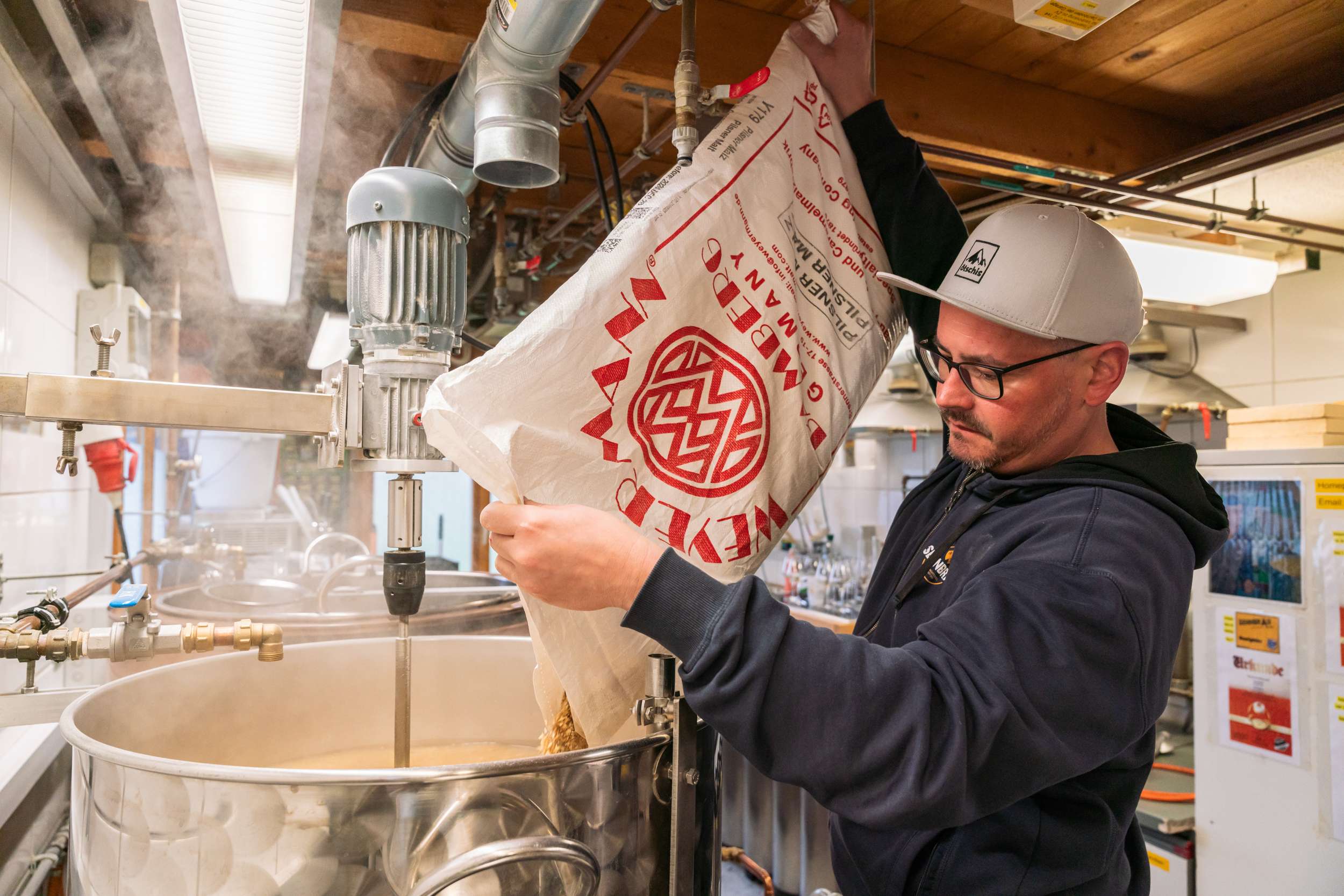 Roger Senn, 39 Jahre alt, redet schnell. So schnell, dass er manchmal vergisst, dass ich mich nicht auskenne. So muss ich ihn mehrmals unterbrechen: «Moment, wie war das noch mal mit den Enzymen?» – «Sagtest du ‹einmischen› oder ‹einmaischen›?» – «Äh, Arvenholzspäne?» So schnell er spricht, so herzlich lacht er. Und er lacht oft und gerne. Kurz: Er ist ein leidenschaftlicher, geselliger und sehr offener Mensch. «Ich habe Menschen gern», antwortet er auf meine Bitte, sich selbst zu charakterisieren. «Und ich habe Energie für zehn», fügt er schmunzelnd hinzu. Die braucht er auch, schliesslich ist er für den gesamten Prozess selbst verantwortlich – von der Vorbereitung über das Brauen bis hin zum Abfüllen und Etikettieren der Flaschen. Doch dann wird er plötzlich ernst. Beim Bierbrauen müsse man mit dem Kopf bei der Sache sein, sagt er, während wir die wenigen Schritte in das Sudhaus gehen, dorthin, wo gebraut wird. Wie sieht ein typischer Arbeitstag eines Braumeisters aus? «Natürlich habe ich für jedes Bier ein eigenes Brauprotokoll – ein Rezept, an das ich mich halte. Am Vorabend schrote ich das Malz und bereite alles für den nächsten Tag vor. Morgens fülle ich dann die Braupfannen mit Wasser, das mische ich mit dem Malz, und während der Wartezeiten erledige ich andere Dinge: aufräumen, Tanks und Flaschen reinigen, Etiketten aufkleben und Neues ausprobieren.» Oft kommt jemand spontan vorbei, da darf er sich nicht ablenken lassen, sondern muss sowohl die Uhr als auch die Temperaturanzeigen stets im Auge behalten.