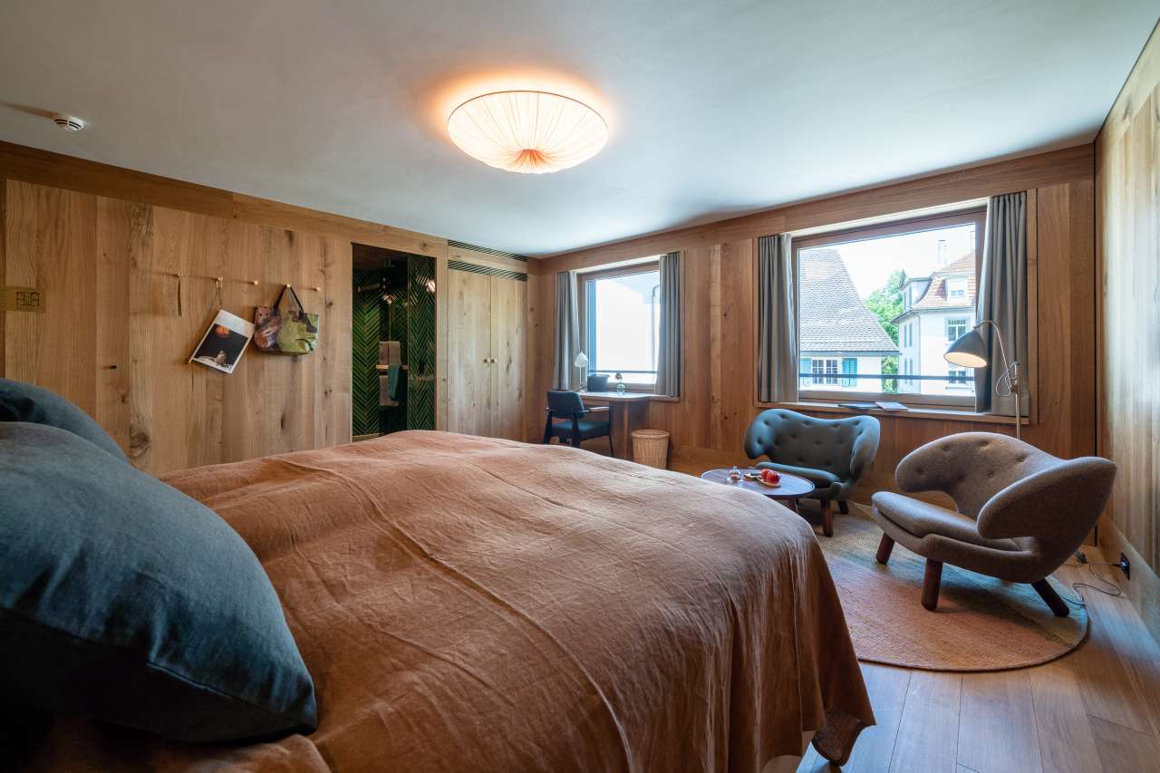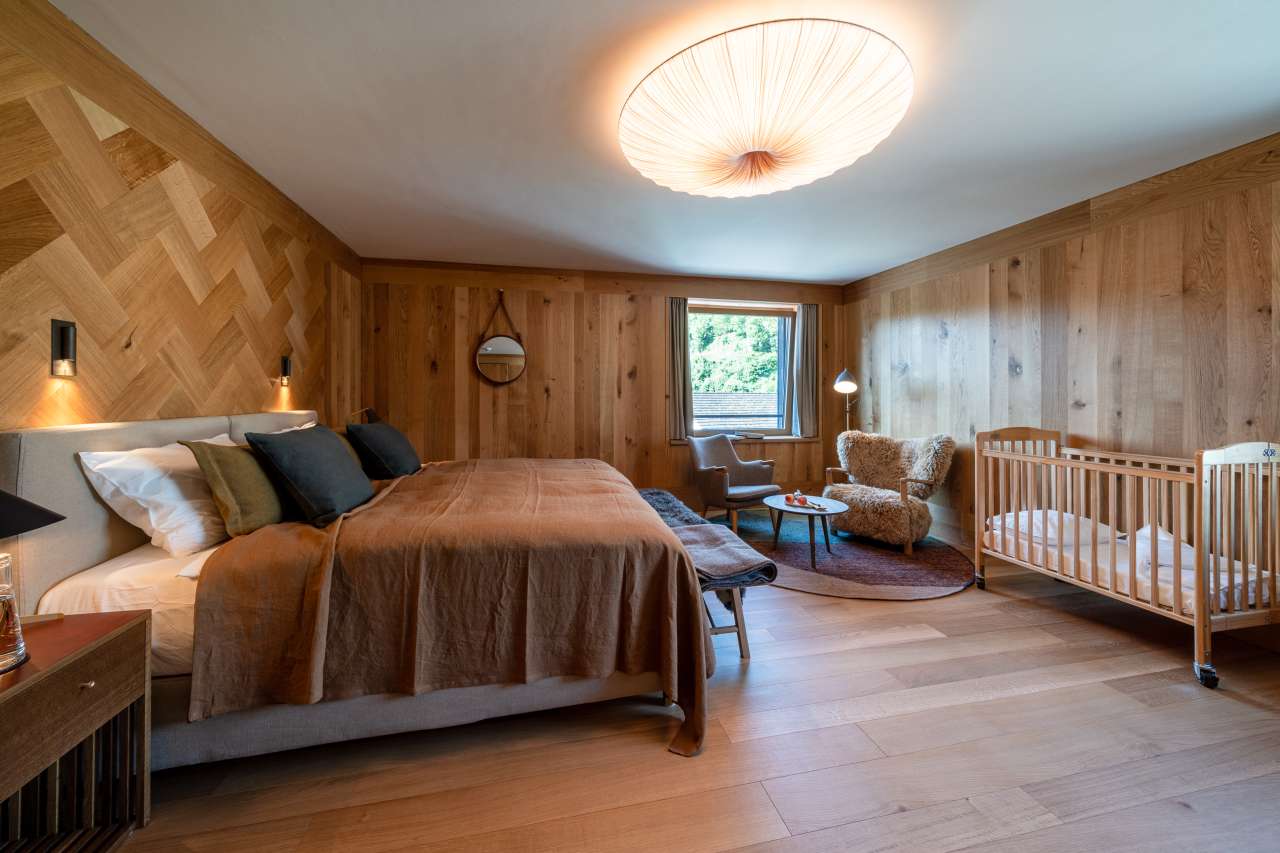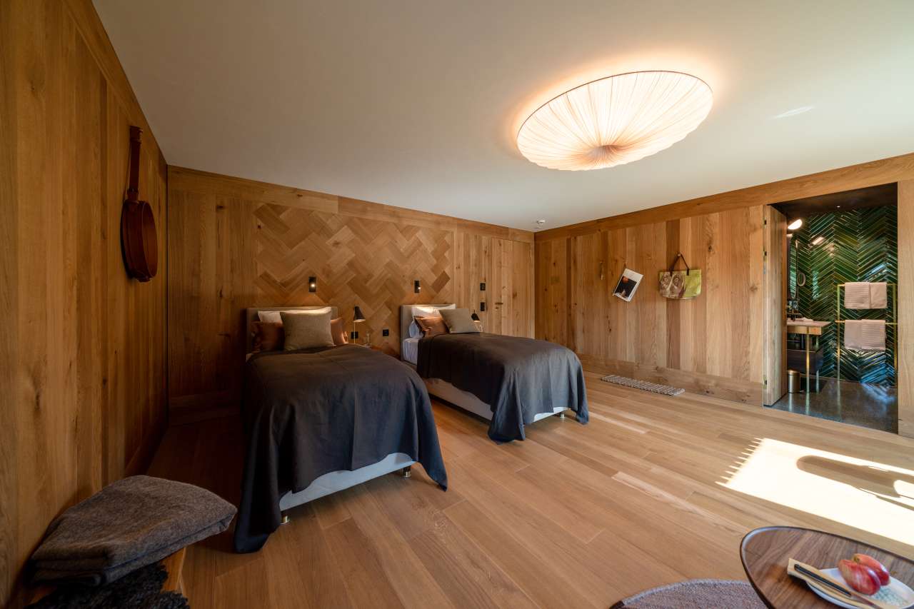 Im dritten Stock, nebst der Treppe auch über einen Lift erreichbar, befindet sich das Familienzimmer, welches die beiden Zimmer Truuba und Trüübli mit einem exklusiven Gang verbindet. Dank einer grosszügigen Wohnfläche, Einbauschränken und zwei Badezimmern hat es ausreichend Platz für die ganze Familie. Allen Gästen stehen mit dem Kissenmenü verschiedenste Kissen zur Auswahl.